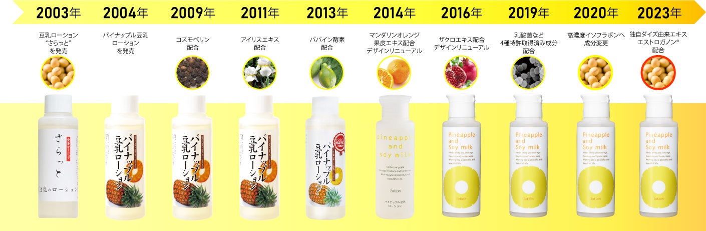 「本当に実感できるもの」を追求した結果、リニューアルを繰り返し、常に進化し続けています。新成分を見つけるたび、安全性や配合バランスを何度も検証し、今お届けできる最良の製品を世に送り出しています。また、パイナップル豆乳シリーズに使用する高純度・高濃度なイソフラボンの抽出技術は、独自の研究開発によるものです。2022年2月には、独自大豆由来成分『エストロガノン®』の商標登録が承認されました。