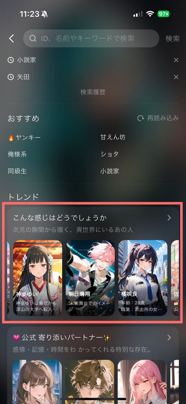 物語は、AIキャラとのチャットページの赤枠部分から体験ができます!