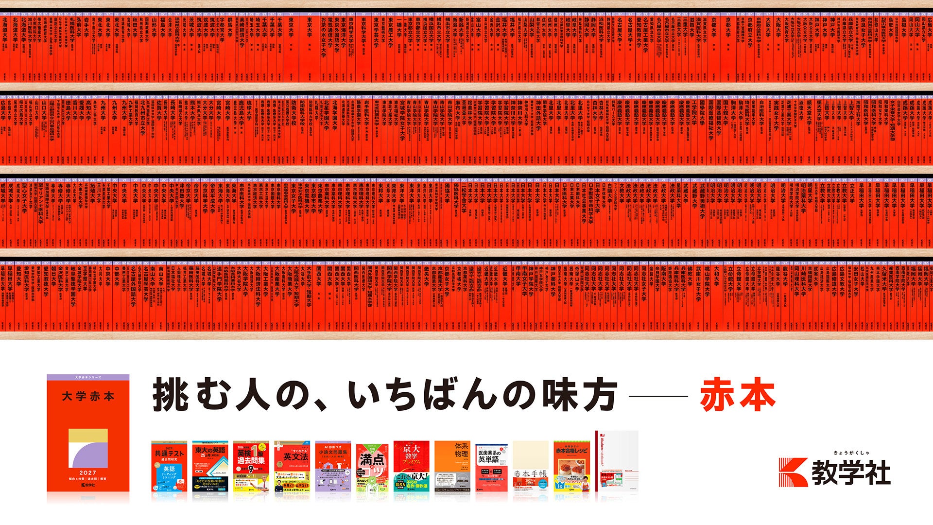 教学社(きょうがくしゃ)は株式会社 世界思想社教学社の教育図書出版部門として1951年に設立され ました。1954年に創刊した大学入試の過去問題集「大学赤本シリーズ」(通称“赤本”)は、369大学552 点の刊行点数(2027年版)で全都道府県を網羅しており、70年以上に渡って多くの受験生の挑戦を支 えてきました。近年はチャンネル登録者数が7万人を超えるYouTube「赤本チャンネル」や「赤本オンライン」など、デジタルやオンラインを通じた支援も行っています。赤本AIにより、さらに受験生に寄り添った新しい学習サービスを実現してまいります。