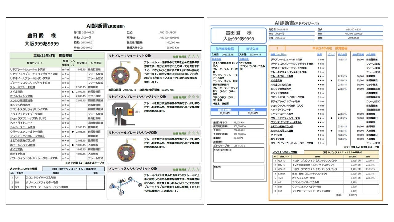 自動車ディーラー・自動車整備工場向けに提供する、AIによる車の部品交換・整備予測を支援するシステムです。車両情報をシステムに入力するだけで、AIが約80項目の整備内容を診断し整備の必要有無について推奨度を算出した「AI診断書」を作成します。