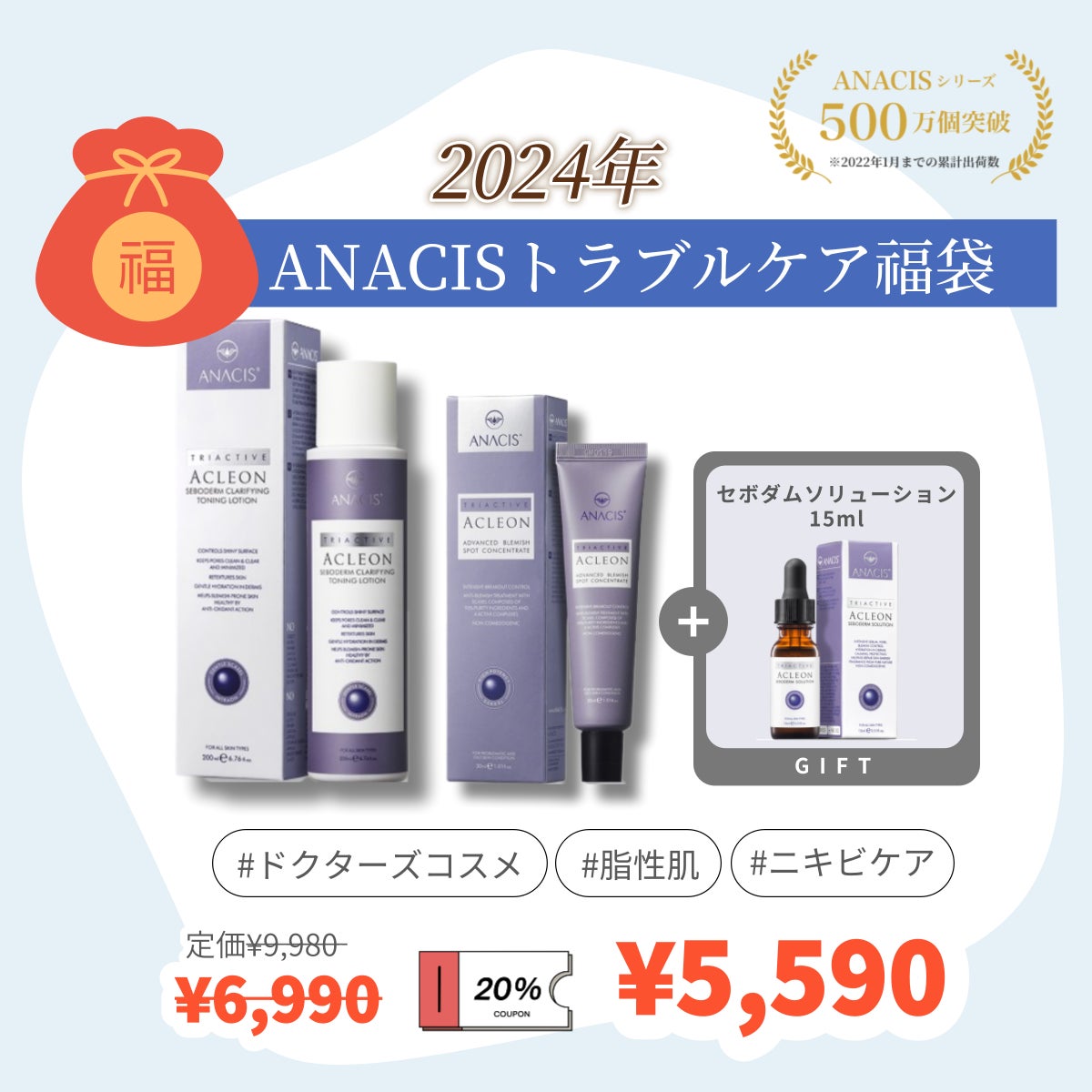 韓国のH&Bストアである「オリーブヤング」でも取り扱われているドクターズコスメブランド「ANACIS」のアクネラインの最強商品が詰め込まれたお肌トラブルを根本から撃退できる福袋。