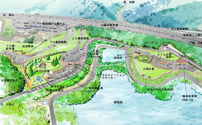 権現湖の水と緑などの自然、古墳などの歴史に恵まれた環境で豊かな自然を感じながらゆっくりとした時間を過ごせる癒しの公園として誕生します。