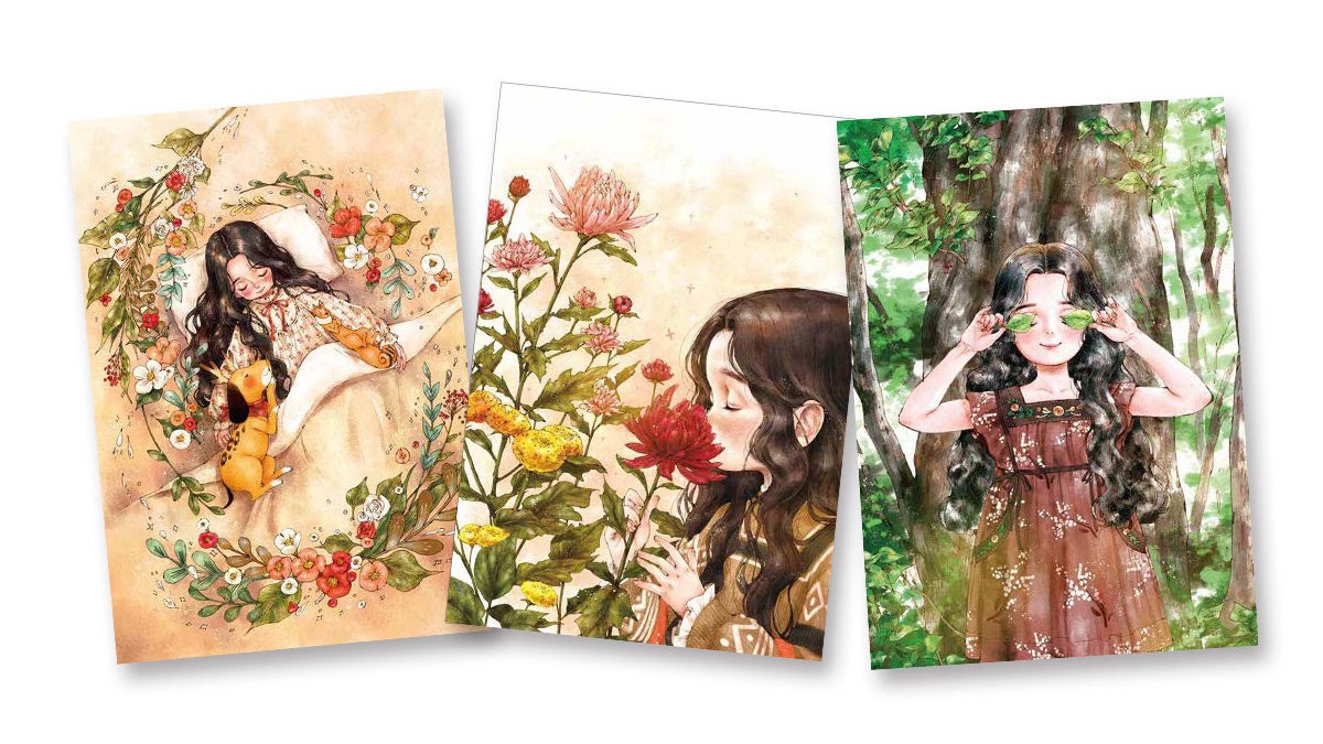 森に暮らす少女のゆったりとした日常を切り取った可愛い絵ばかり26作品が入っています。お部屋でひなたぼっこ、うきうきのクリスマス、いい香りのお花に囲まれるひとときなど、四季折々の絵柄がたくさんあるので、季節のご挨拶に使うカードにもぴったり! もちろん、お部屋に飾っておくのもおすすめです。