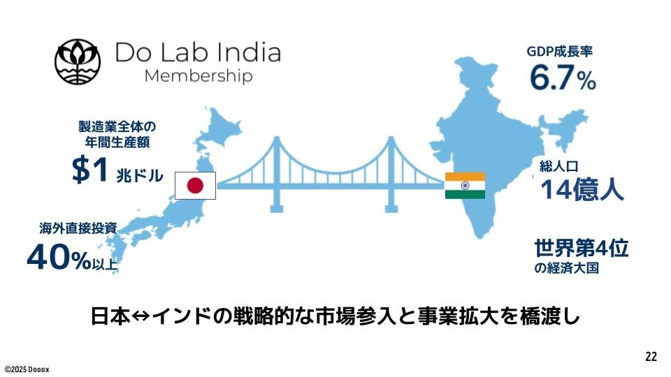 株式会社Dooox(東京都千代田区、代表取締役 久保寺亮介)は、2025年6月30日、日本企業のインド市場進出を実践的にサポートするメンバーシップ制プラットフォーム「Do Lab India Membership」のサービス提供を開始いたします。本サービスは、単なる情報提供を超え、企業の「挑戦」を「実行」へと導くことを目的とした、インド進出支援に特化した革新的なビジネス推進プラットフォームです。