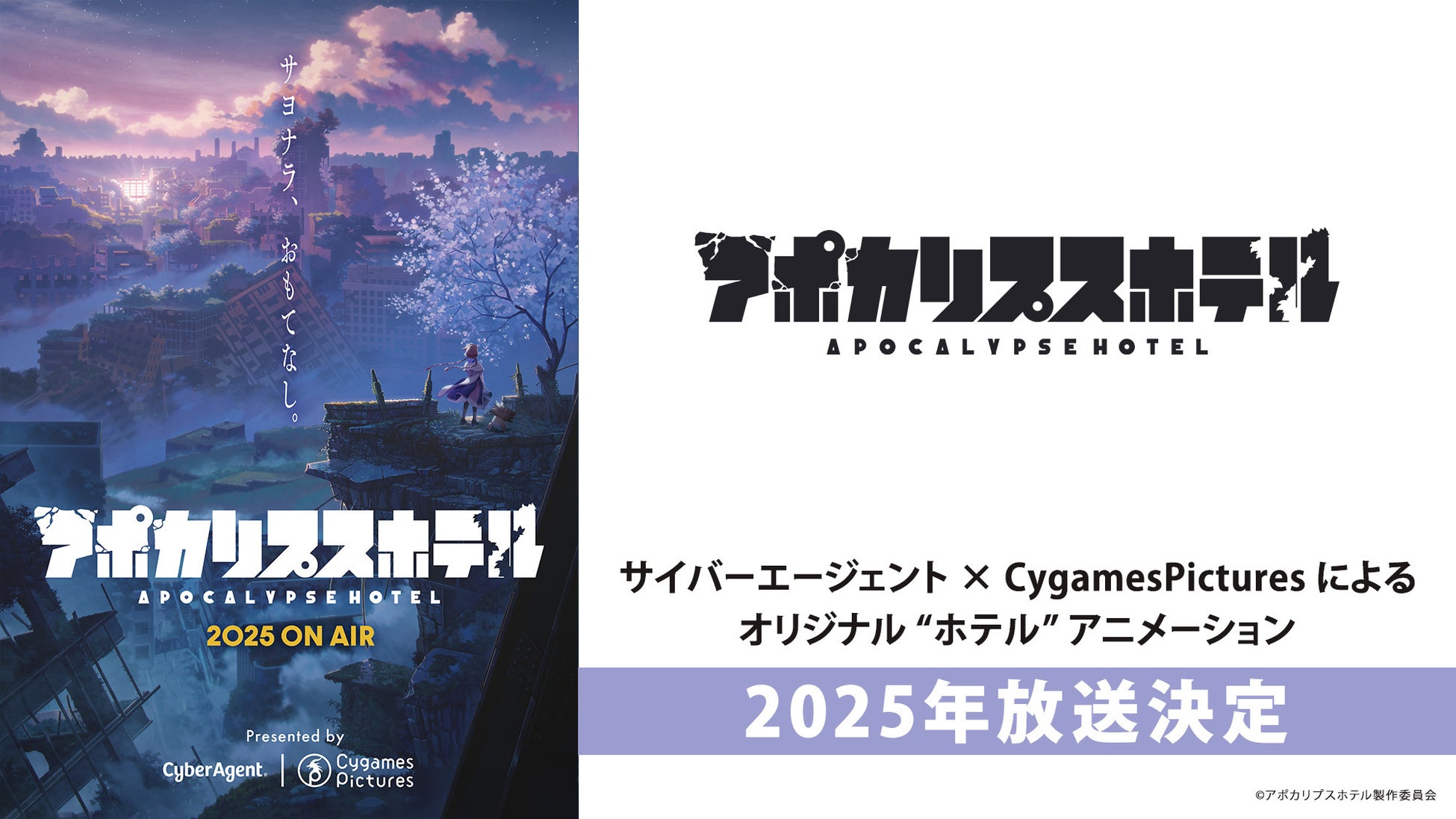 株式会社サイバーエージェント(本社:東京都渋谷区、代表取締役:藤田晋、東証プライム市場:証券コード4751)と、アニメーション制作関連会社の株式会社CygamesPictures(本社:東京都練馬区、代表取締役社長:竹中信広)は、オリジナル“ホテル”アニメーション企画として、 TVアニメ「アポカリプスホテル」を2025年に放送開始することをお知らせいたします。本作は、サイバーエージェント×CygamesPicturesでの共同企画となり、オープニング主題歌はaikoとのタッグが決定しました。オープニング主題歌「skirt」を使用したティザー映像を公式サイトにて公開しております。
