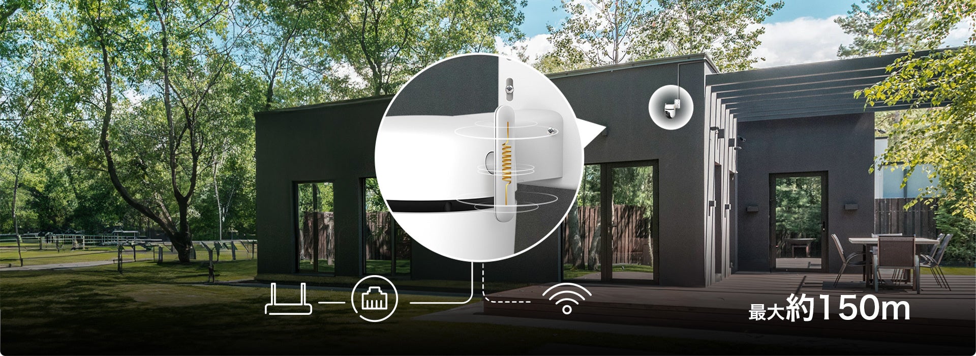 *1:約150mのWi-Fiカバー範囲は、開けた場所でのTP-Linkのテスト結果に基づいた数値です。実際のカバー範囲は、環境・ルーターの仕様・その他の要因によって異なる場合があります。