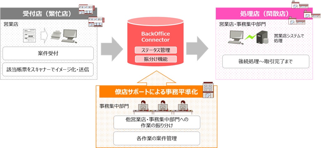 本仕組みは、当社の金融機関様向けデジタルチャネルソリューション「Digital Branch」の後方事務集中化ソリューション「BackOffice Connector」を用いて実現し、各営業店・本部で受け付けた帳票を事務集中部門や他店舗へイメージデータで作業依頼するものです。