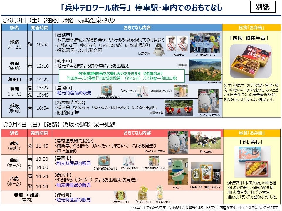 9/3(土)、『兵庫テロワール旅号』出発にあわせ、姫路駅長による出発合図、地元関係者による横断幕やオリジナルうちわを掲げてのお見送りを実施予定