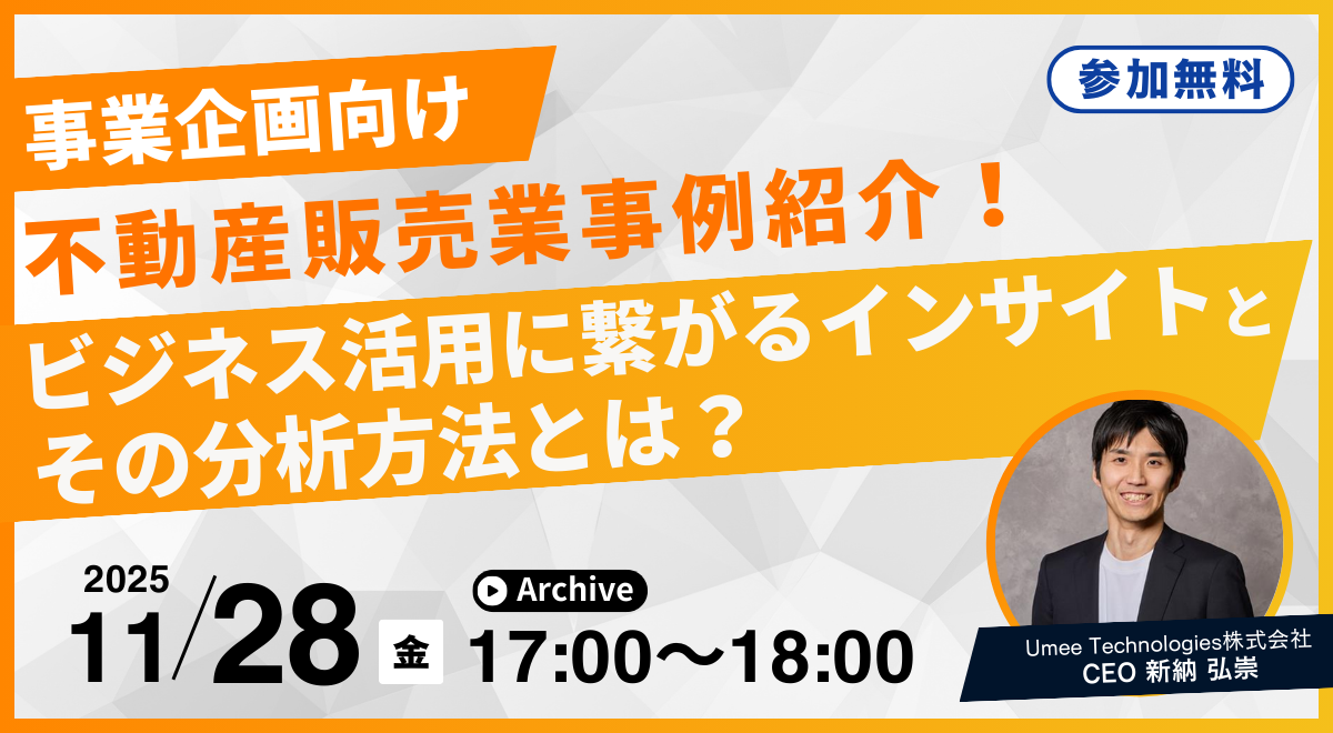Umee Technologies株式会社(本社:東京都調布市、代表取締役:新納 弘崇)は、インサイト分析に高い関心を持ちながらも、分析のハードルの高さや結果の不明瞭さから踏み出せずにいる事業企画担当者を対象に、「不動産販売業事例紹介!事業企画向け、ビジネス活用に繋がるインサイトとその分析方法とは?」と題した無料オンラインセミナーを、2025年11月28日(金)17:00~開催いたします。このセミナーは11/21に行った同セミナーのアーカイブ配信です。