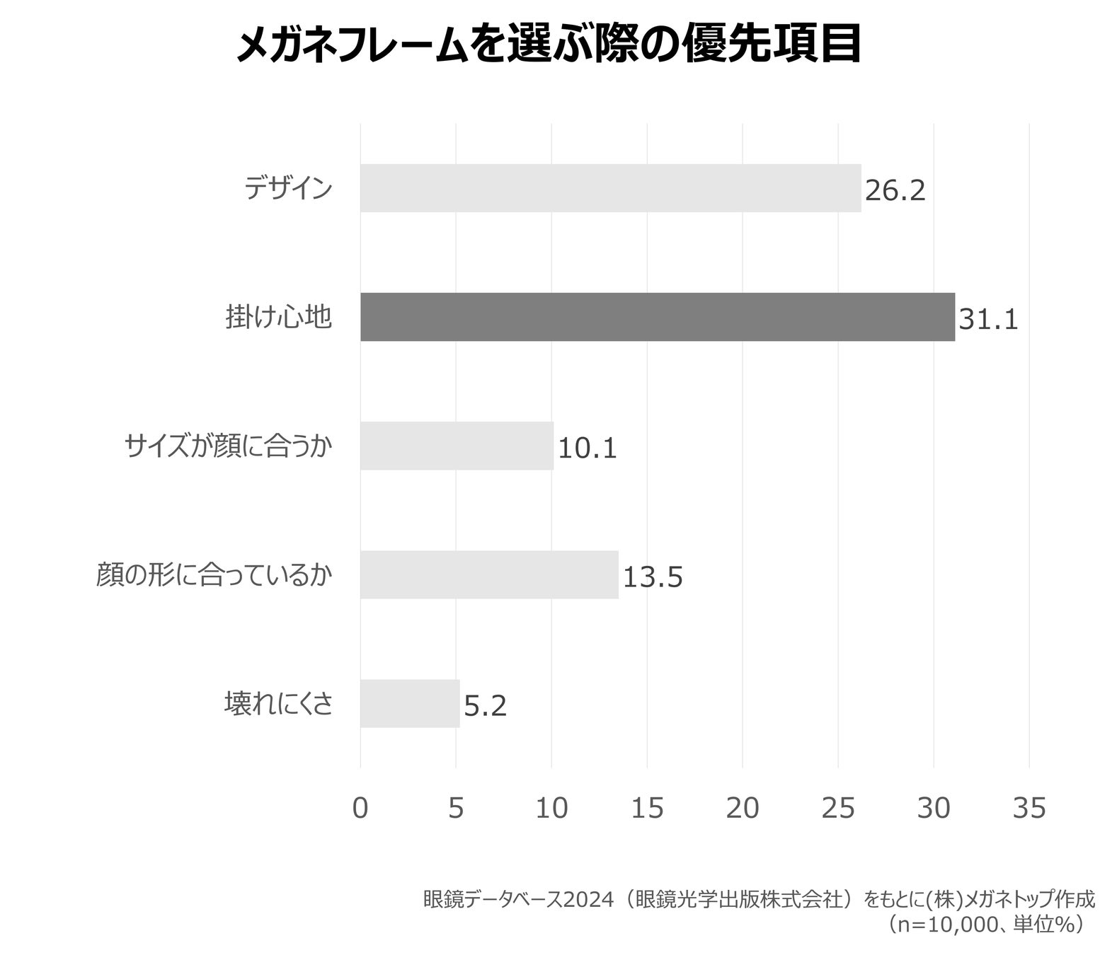 『眼鏡データベース2024(眼鏡光学出版株式会社)』が「メガネフレームを選ぶ際の優先項目(n=10,000)」について調査した結果、「掛け心地」が31.1%で第1位となり、最も優先する項目であることが明らかに。このようなメガネ装用者の声を受け、眼鏡市場では、掛け心地が良く長時間着用しても快適なメガネフレームの開発をスタートしました。