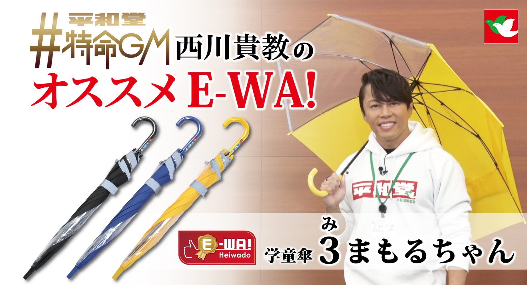 「平和堂 特命GM西川貴教のオススメEWA!」シリーズは、西川さんが平和堂こだわりブランド「E-WA!」の商品を実際に試食・試用し、商品の特徴やおすすめポイントを動画で紹介する企画です。第3弾の商品は、3つの機能でお子様の安全を見守る「学童傘3(み)まもるちゃん」。西川さんが絶賛した3つのこだわり機能の詳細は、ぜひ動画をご覧ください。オススメE-WA!シリーズは、毎月1本公開予定です。来月はどんなオススメE-WA!商品が登場するか、ご期待ください。