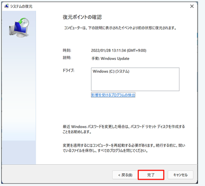 Step4:「復元ポイントの確認」画面の内容を確認し、「完了」をクリックします。