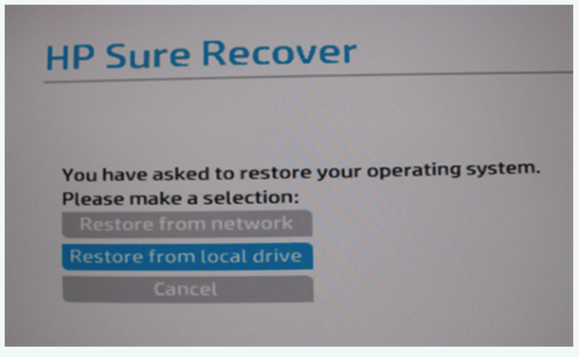 Step2:「HP Sure Recover」の画面が表示されます。上下矢印キーで「Restore from local drive」を選択し「Enter」キーを押します。