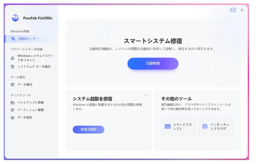 まずご紹介するのは、PassFabのパソコンを修復する専用ツールPassFab FixUWinで修復する方法です。assFab FixUWinは数回クリックするだけで、誤動作しているコンピューターを自動的に診断し、完全に修復します。起動ディスクを作成することで、パソコンに発生しているWindows関連の問題を修復できます。使いやすいデザインで、パソコンの専門知識がなくても簡単に利用できます。