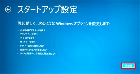 Step6:「スタートアップ設定」の「再起動」をクリックします。