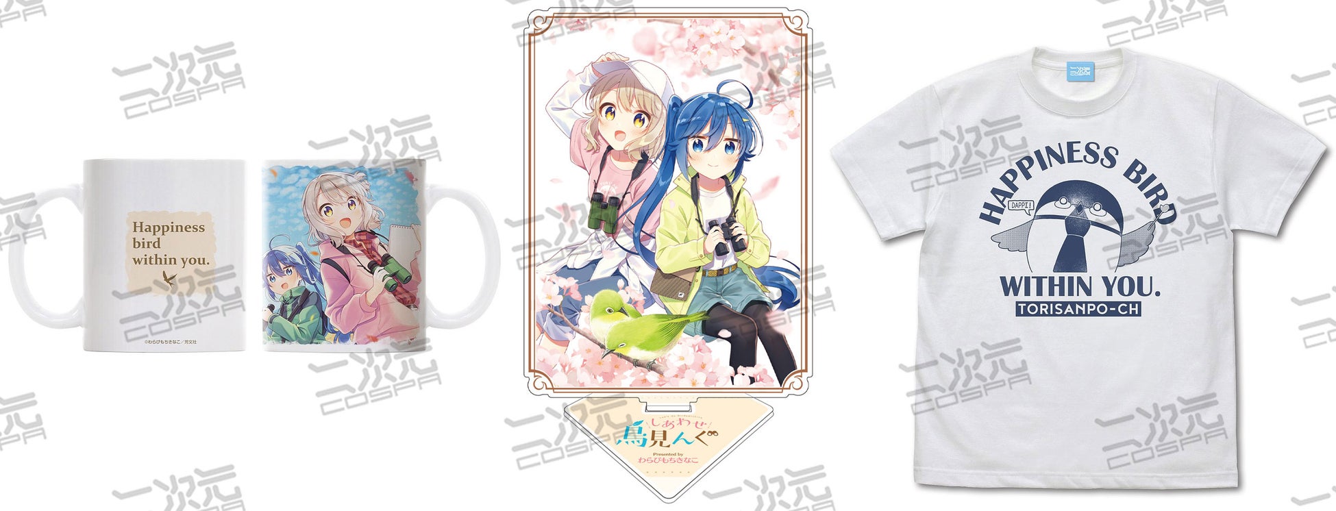 公式キャラクターコスチュームやアパレル、グッズの企画、開発、製造を行う株式会社コスパは、「まんがタイムきらら」にて連載中の"わらびもちきなこ"先生による芸大生×鳥見ガチ勢のバードウォッチング4コマ『しあわせ鳥見んぐ』新グッズ7種を二次元コスパより発表した。