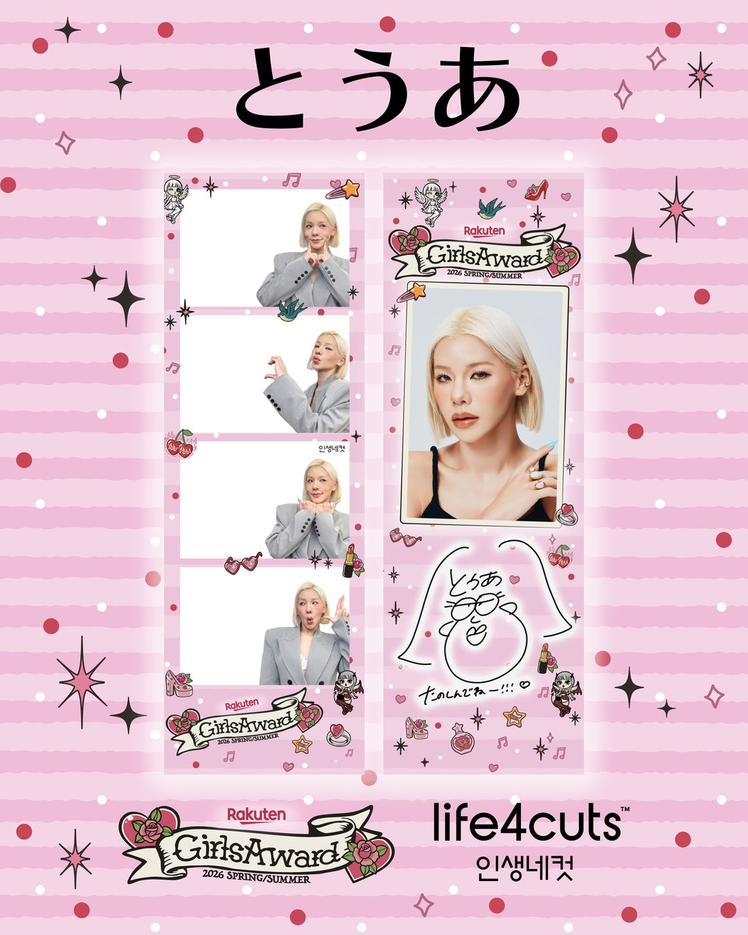 株式会社DONGRAMY PROJECT(本社:福岡県北九州市)が運営する韓国発のセルフフォトプリント「人生4カット」は、 2026年4月18日(土)に代々木第一体育館にて開催される日本最大級のファッション&音楽イベント「Rakuten GirlsAward 2026 SPRING/SUMMER」に出演する、10代を中心に絶大な人気を誇る「とうあ」さんとのトリプルコラボレーションによる、限定オリジナルフレームの展開を決定いたしました。