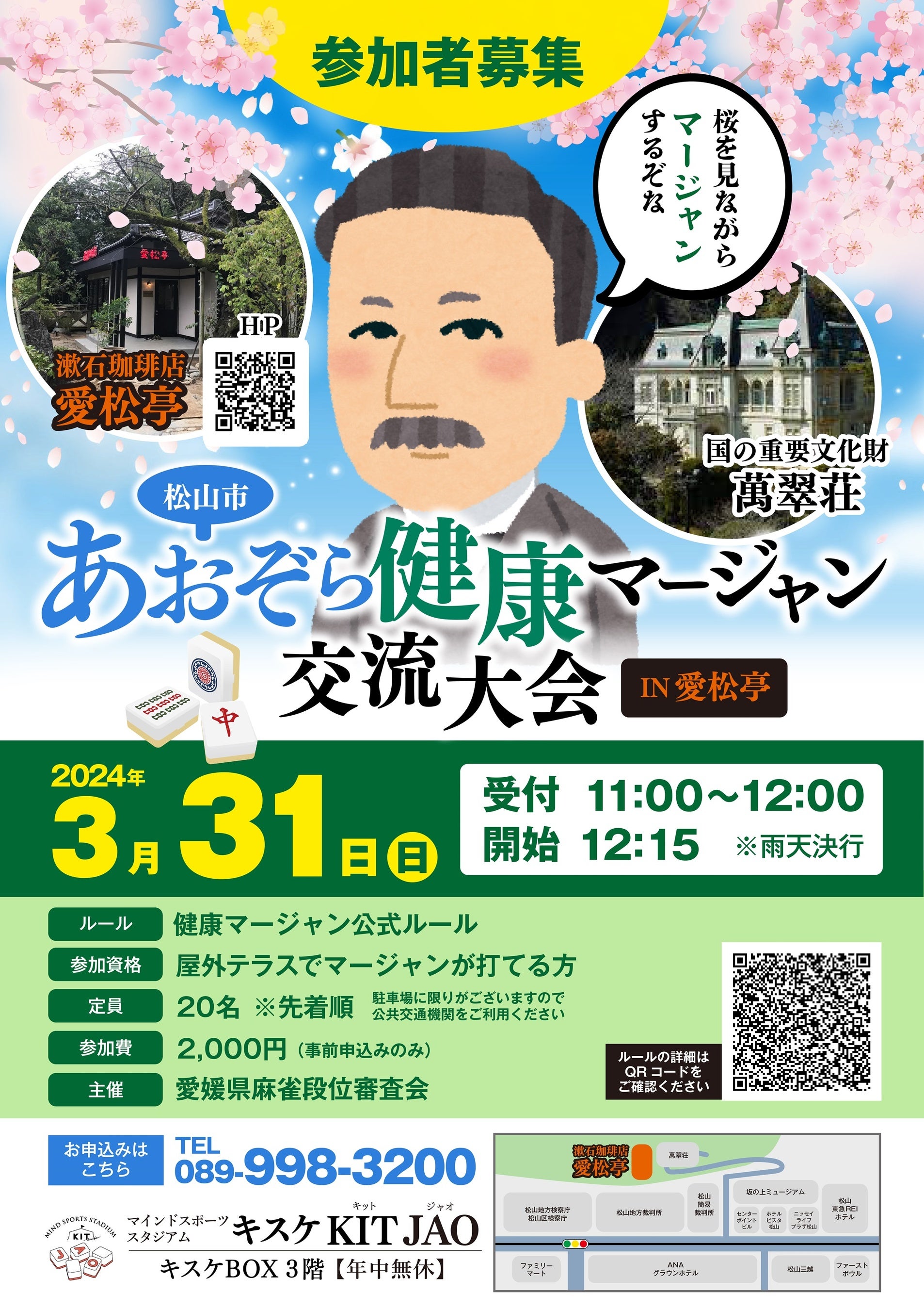 「松山市あおぞら健康マージャン交流大会」は、春の桜のもと健康マージャンを楽しむことを目的に、マージャンが室内に限らずどこでも誰でも楽しめるのではないかという、競技のあり方へ挑戦すべく、また、マージャン店で遊技することのできない、18歳未満の方でも健康的にマージャンという競技の楽しさを体験できる場として開催されます。