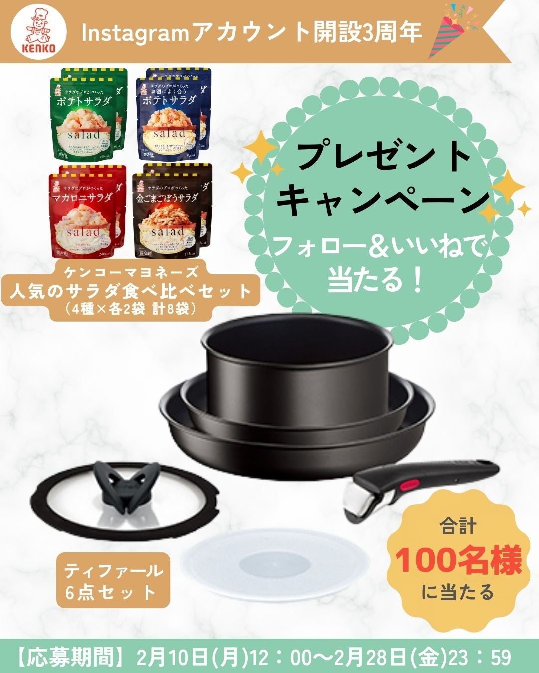 ケンコーマヨネーズ株式会社(東京本社:東京都杉並区、代表取締役社長:島本 国一、以下「当社」)は、当社公式Instagram(@kenko_mayo)が開設3周年を迎えたことを記念して、フォロワー限定キャンペーンを2月10日(月)から、2月28日(金)まで実施します。公式Instagramのアカウントをフォロー&キャンペーン投稿をいいねすると、手軽にサラダが楽しめる『サラダのプロがつくったサラダ』シリーズやティファールの「インジニオ・ネオ IHハードチタニウムアンリミテッド セット6」が合計100名様に当たります。
