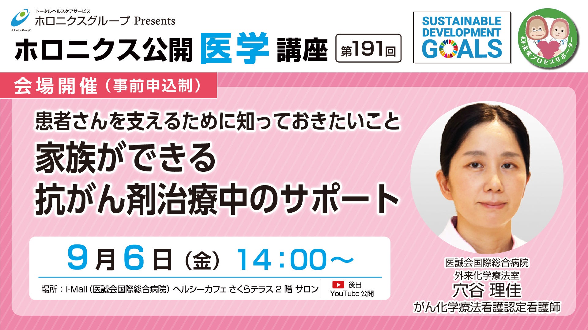 医療法人医誠会(大阪府大阪市 代表者:谷 幸治)では、第191回ホロニクス公開医学講座 『患者さんを支えるために知っておきたいこと 家族ができる抗がん剤治療中のサポート』を大阪市北区南扇町にあるi-Mall内ヘルシーカフェ「さくらテラス 2階サロン」にて2024年9月6日(金)に開催いたします。