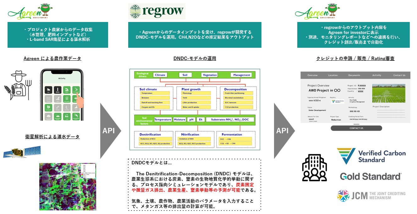 Regrowが保有するDNDCモデル※1(農業由来の排出量を精緻に特定する技術)と、Green Carbonが展開するカーボンクレジット創出支援ワンプラットフォームサービス「Agreen(読み:アグリーン)※2」を技術連携させることで、国際的なカーボンクレジット市場の基準に準拠した信頼性の高いカーボンクレジットの創出を目指します。