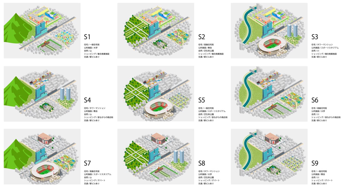 そこで、住宅、公的施設、商業施設、緑、自然の属性を変えた9つの都市サンプルを生成し、居住意向への影響を検証した。その結果、日本では、緑は居住意向を高める一方で、自然は居住意向を低めることを示した。