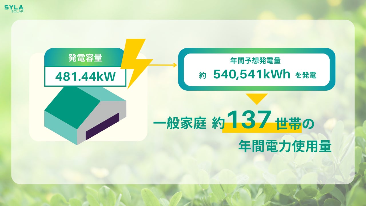 年間予想発電量は約540,541kWhで、これは一般家庭約137世帯分の年間電力消費量に相当します。(※1)