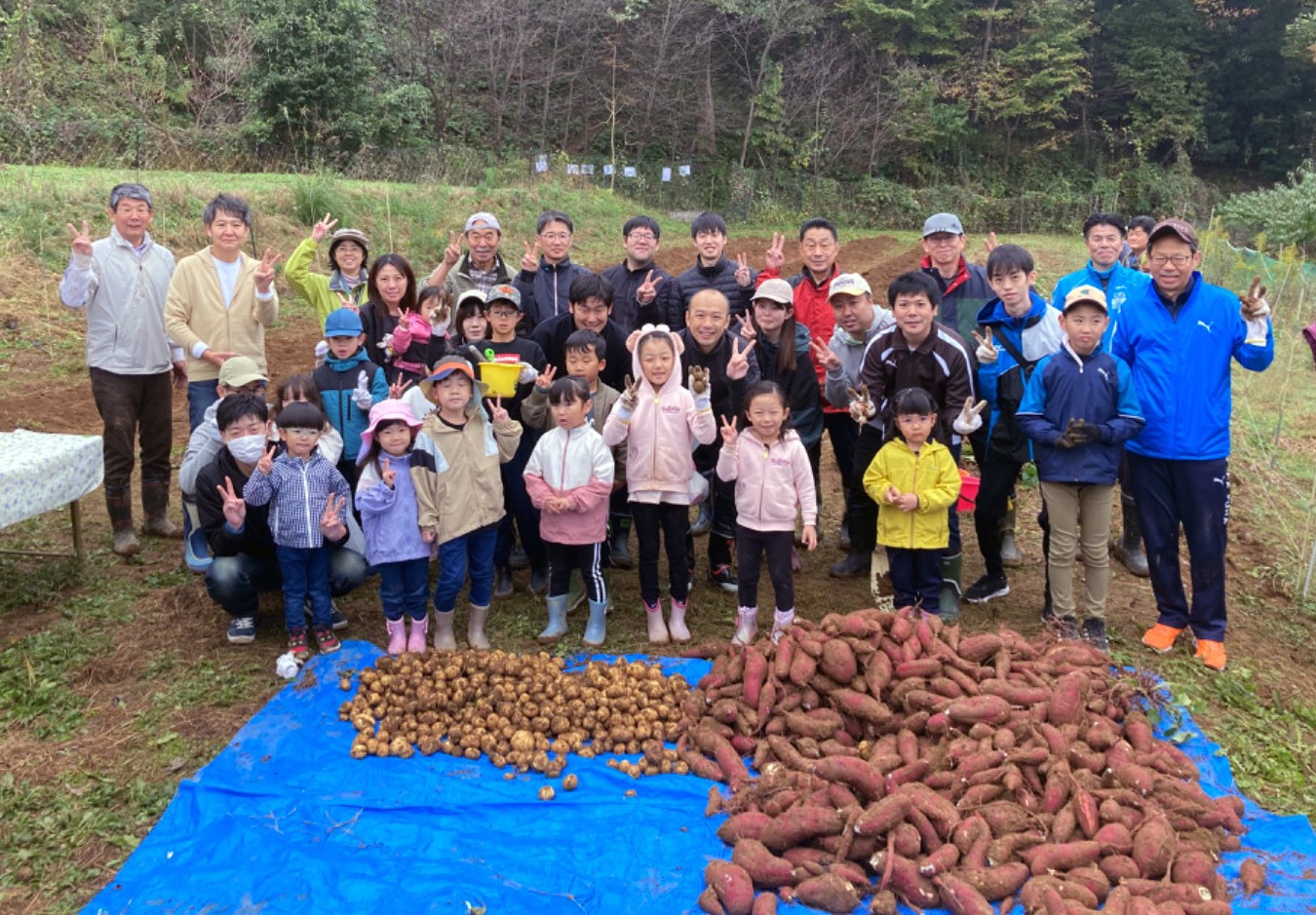 このたび、2011年8月から活動を実施している、中央市の耕作放棄地と隣接する荒廃した森林の保全・再生事業として、役職員およびその家族が参加し、再生した畑で栽培したサツマイモやジャガイモを収穫いたしました。