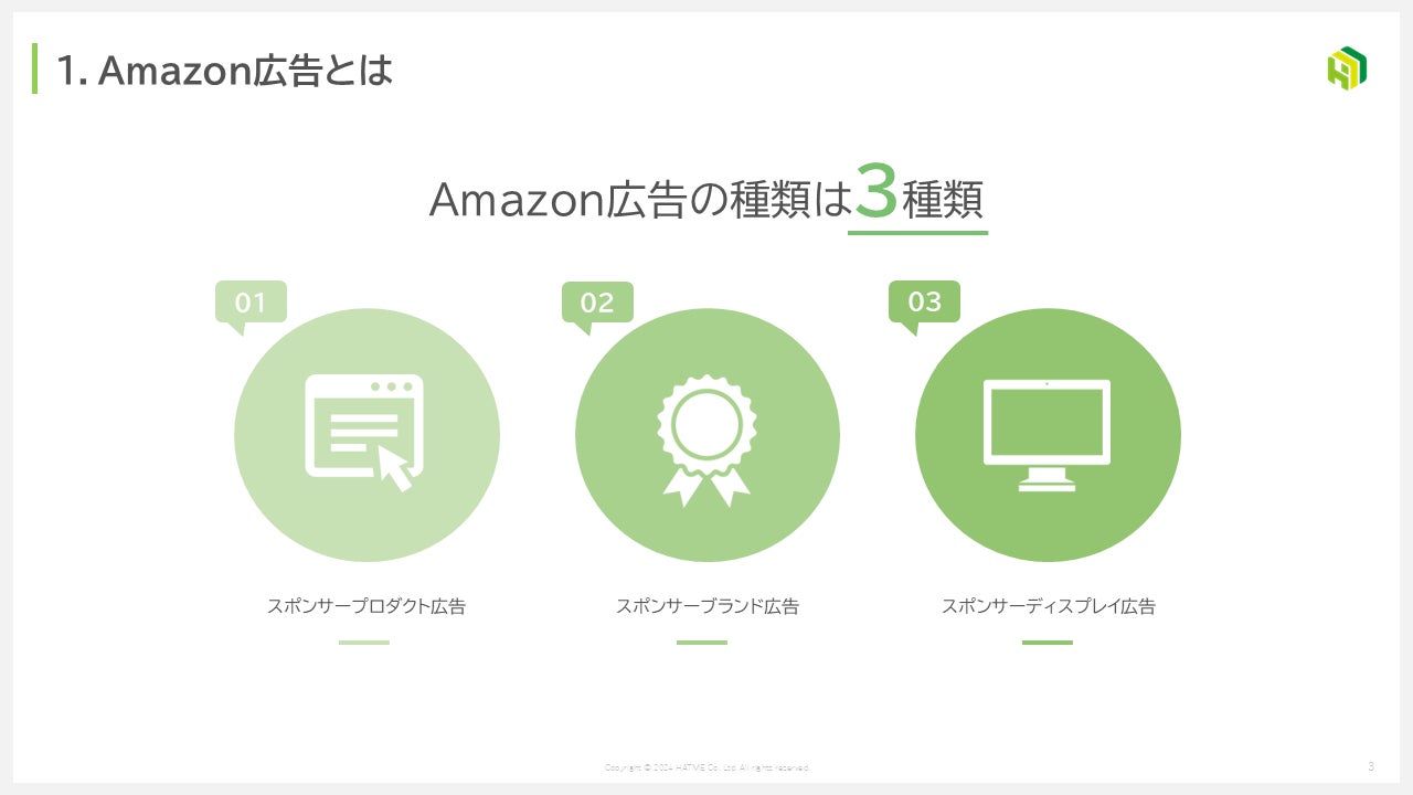 Amazon広告には「スポンサープロダクト広告」「スポンサーブランド広告」「スポンサーディスプレイ広告」の3種類があります。