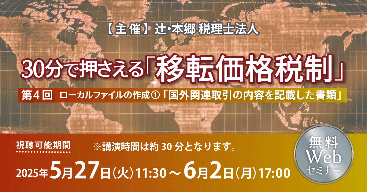 辻・本郷 税理士法人(本社:東京都新宿区、理事長:桑木小恵子)は、2025年5月27日(火)より「30分で押さえる「移転価格税制」(第4回)ローカルファイルの作成①「国外関連取引の内容を記載した書類」」セミナーを開催いたします。