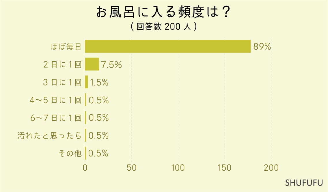 お風呂に入る頻度の問いに対して最も多かったのが「ほぼ毎日(89%)」でした。 次いで「2日に1回(7.5%)」「3日に1回(1.5%)」という結果でした。ほぼ毎日入る方がほとんどでしたが、数日に1回入るという方も10%程度いるようです。