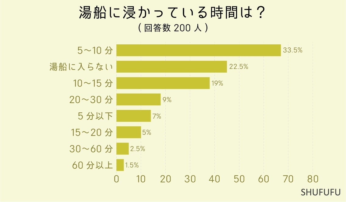 湯船に浸かっている時間は?を尋ねたところ、1位は「5〜10分(33.5%)」、2位「湯船に入らない(22.5%)」となりました。3位が「10~15分」で、湯船に15分以下浸かるという人は半数以上になりました。
