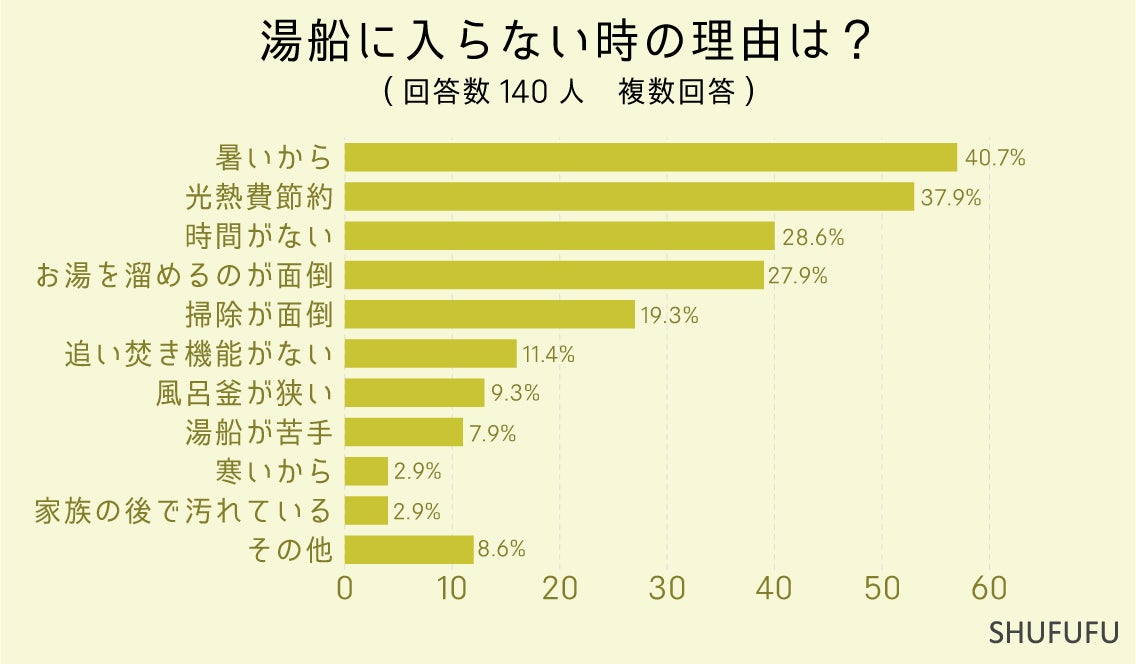 湯船に入らない時の理由では「暑いから」が最多でした。シャワーでさっと体を洗い流す方が体が熱くなり過ぎず良いのかもしれませんね。