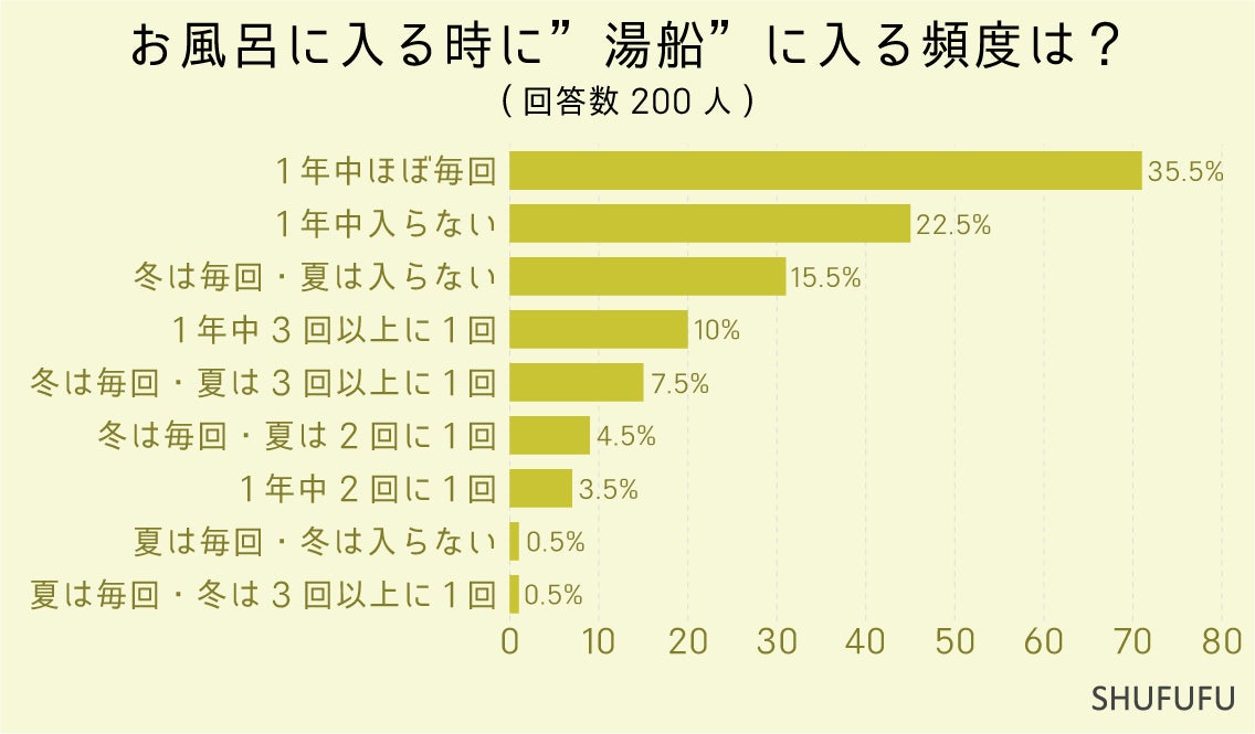 お風呂に入る時に”湯船”に入る頻度に関しては、「1年中ほぼ毎回」が1位でした。ただお風呂にほぼ毎日入る人でも湯船まで入っている人は少数派になりました。