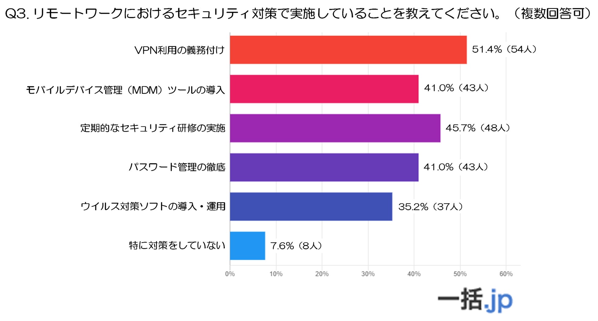 リモートワークにおけるセキュリティ対策として最も多く実施されているのは「VPN利用の義務付け」で51.4%となりました。
