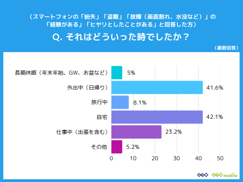 スマホのトラブル(紛失・盗難・故障)を「経験したことがある(36.7%)」「ヒヤリとしたことがある(29.3%)」人は合計で66.0%に上りました。トラブルの原因は「落下・画面割れ(61.9%)」が圧倒的ですが、「水没(20.9%)」「経年劣化(15.6%)」も多く発生しています。発生場所については「自宅(42.1%)」と「外出中・日帰り(41.6%)」が拮抗しており、日常生活のあらゆる場面でリスクが潜んでいることがわかります。