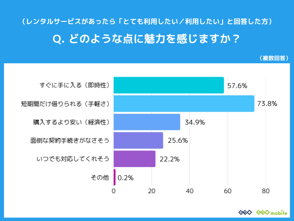 もしもの時に即日~数日で必要な期間だけスマホを借りられる「レンタルサービス」に対し、「とても利用したい(10.8%)」「利用したい(26.7%)」を合わせて37.5%が利用に前向きな姿勢を示しました。魅力に感じる点としては「短期間だけ借りられる(73.8%)」「すぐに手に入る(57.6%)」が高く、「購入するより安い(34.9%)」という経済性も評価されています。一時的な代替機としてのニーズや、手続きのスピード感が求められていることがわかります。