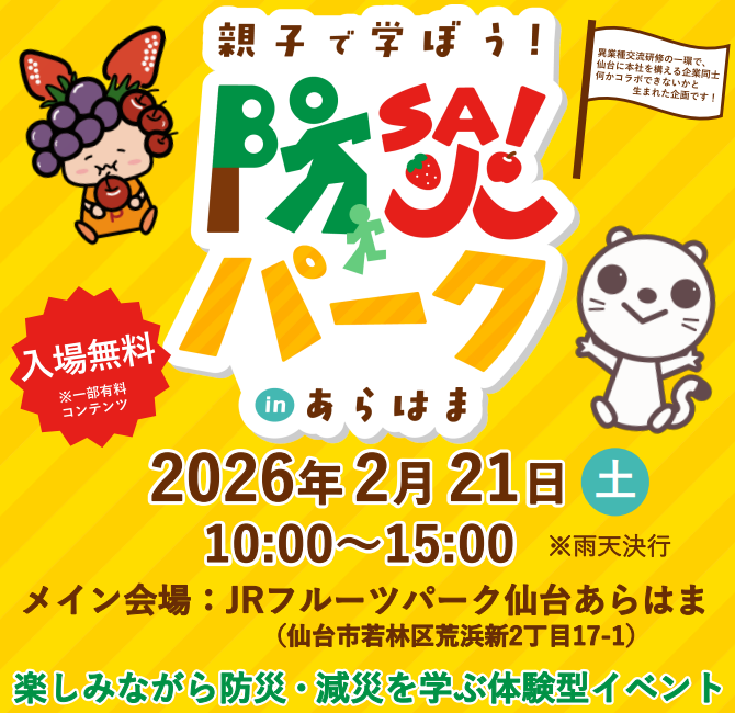 仙台ターミナルビル㈱(所在地/仙台市青葉区、代表取締役社長/松﨑哲士郎)は、2026年2月21日(土)にJRフルーツパーク仙台あらはま・深沼うみのひろばにおいて、「親子で学ぼう!防災パークinあらはま」を開催いたします。