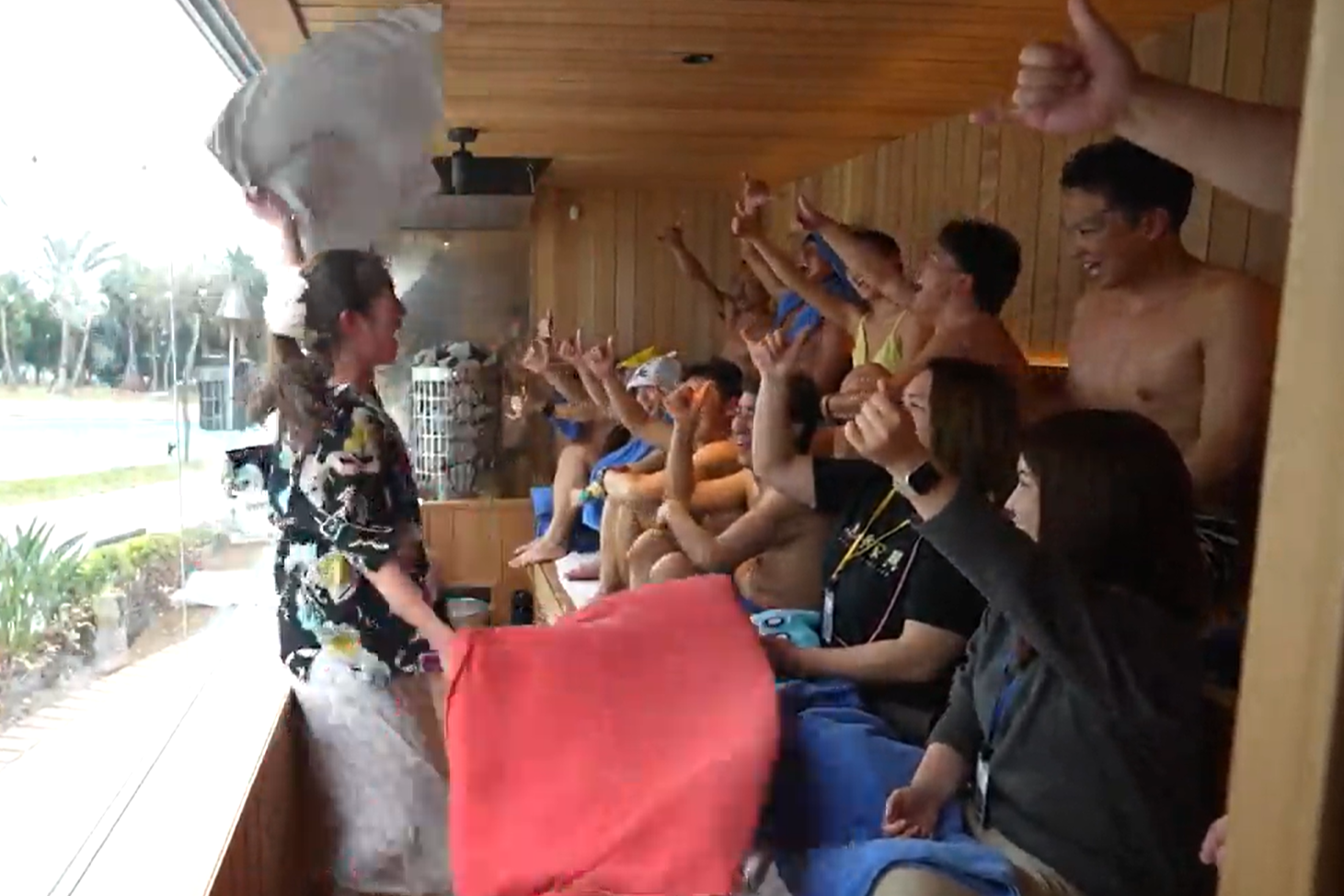 アアウトドアサウナでは、熱波市アイドル「なみきんぐ」氏によるアウフグースイベントを開催。沖縄の音楽をBGMに、躍動感あふれる華麗な熱波が会場全体を熱狂の渦へと巻き込みました。