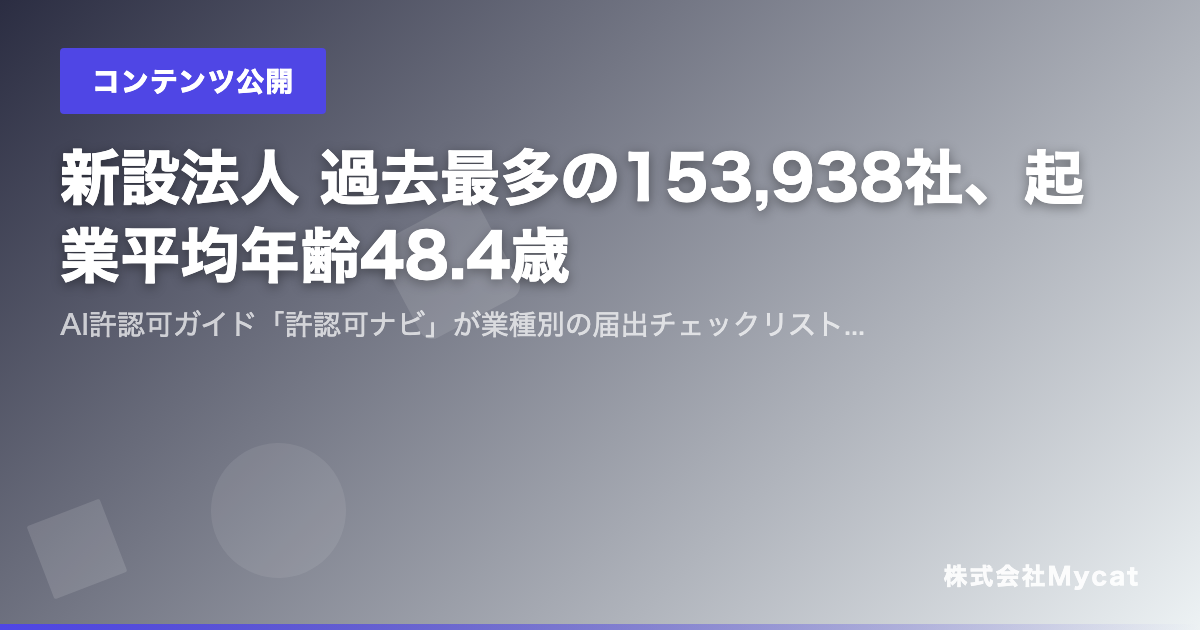 新設法人 過去最多の153,938社、起業平均年齢48.4歳 ── AI許認可ガイド「許認可ナビ」が業種別の届出チェックリストを無料公開