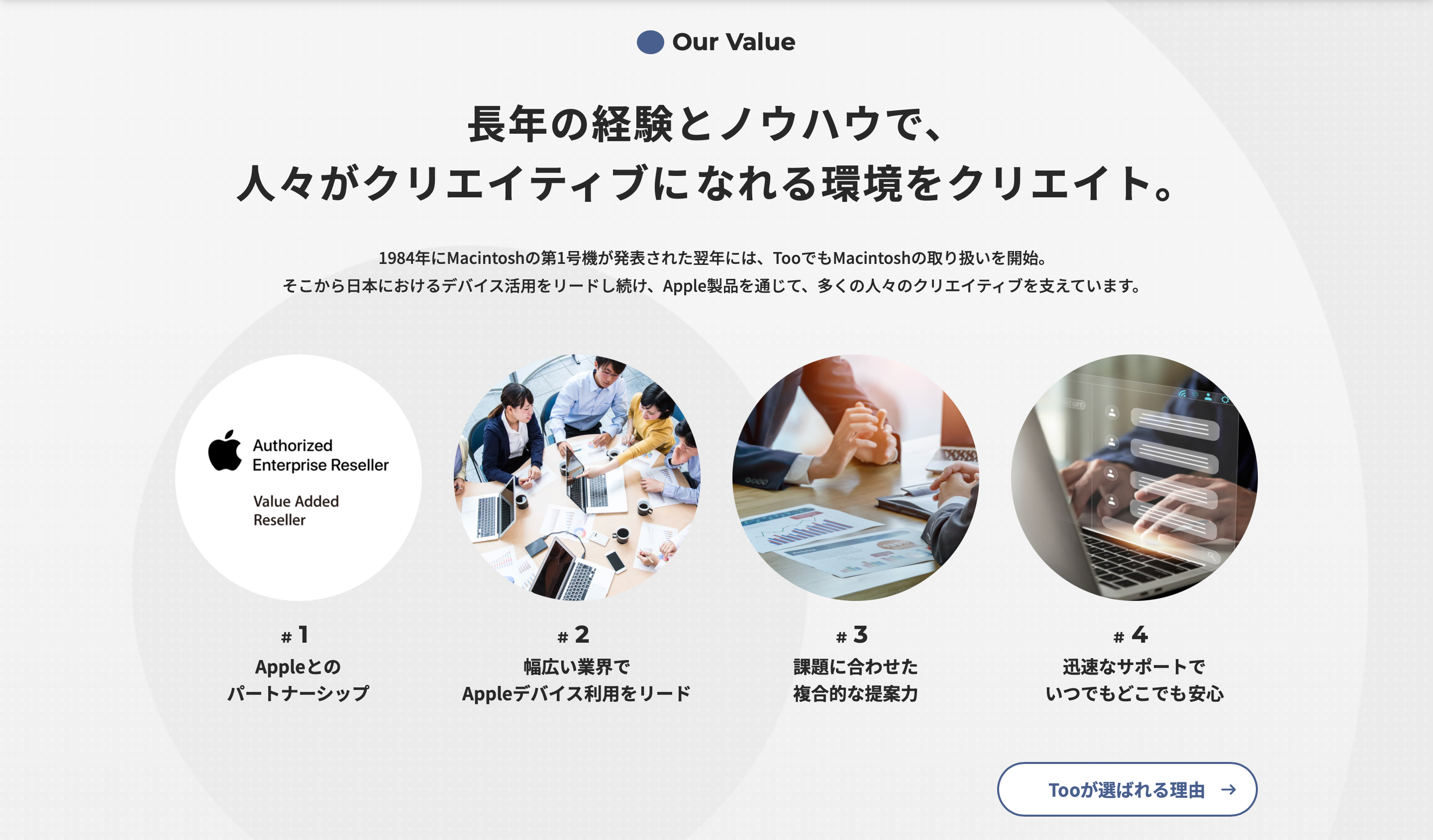 Tooは、2022年にビジネス現場に最も高度な付加価値を提供するパートナーとしてAppleと「Apple Authorized Enterprise Reseller」契約を締結。すべてのビジネス・教育現場でAppleデバイスをより有効に利用できるよう、日本市場をリードしています。