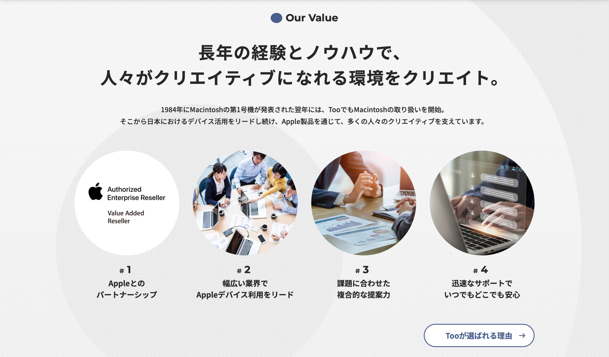 TooのAppleサイトでは、Apple製品のビジネス導入・教育機関導入に関してTooが選ばれる理由や、提供するソリューションを掲載しています。ビジネス・教育機関における豊富な導入事例やIT管理者向けTips、Apple製品をとりまく最新情報も発信しています。