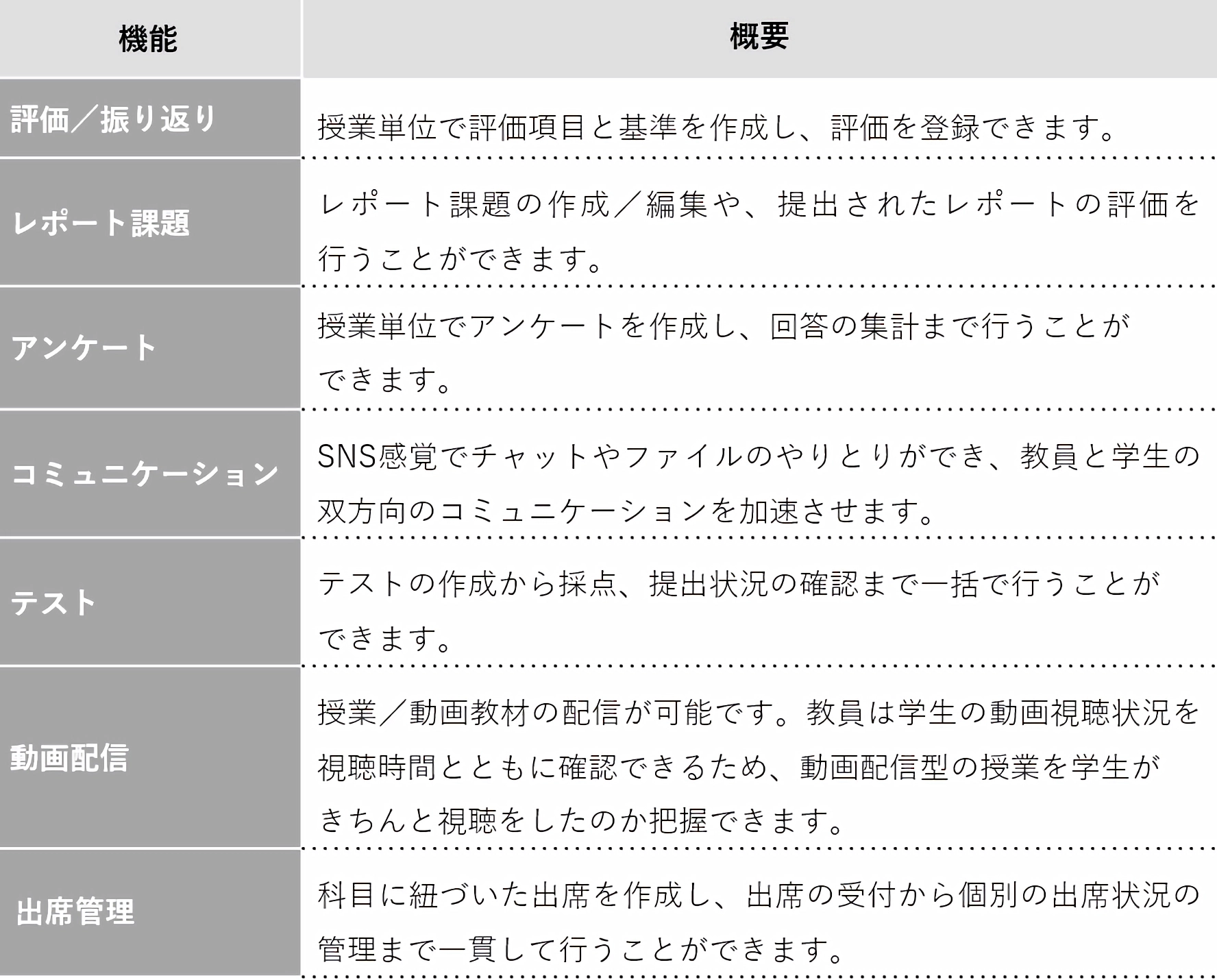 また、授業前の資料配布や講義動画の配信、出欠確認、グループワーク、授業後のレポートやテストなど、教員と学生の間のコミュニケーションを円滑にサポートします。