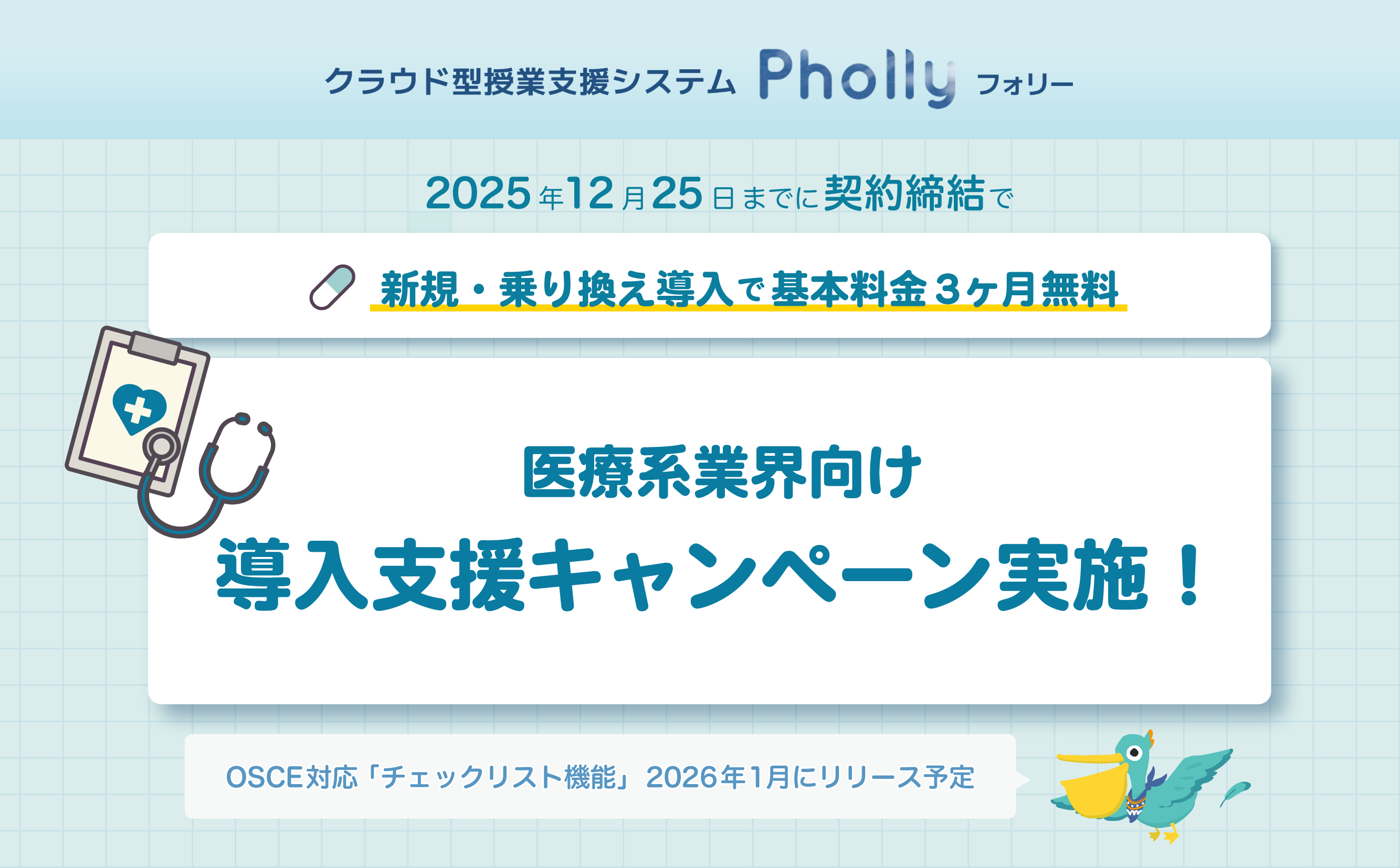 そこで本キャンペーンでは、2025年12月25日(木)までにPhollyの契約を締結された医療系学校を対象に、利用開始後の月額料金を3ヶ月間無料といたします。これにより初期コストを抑えながら、スムーズなシステム導入を実現していただけます。