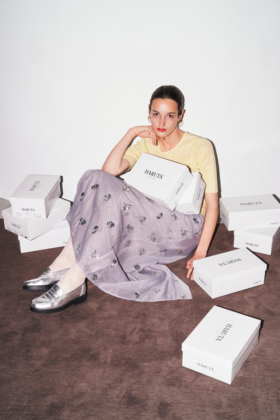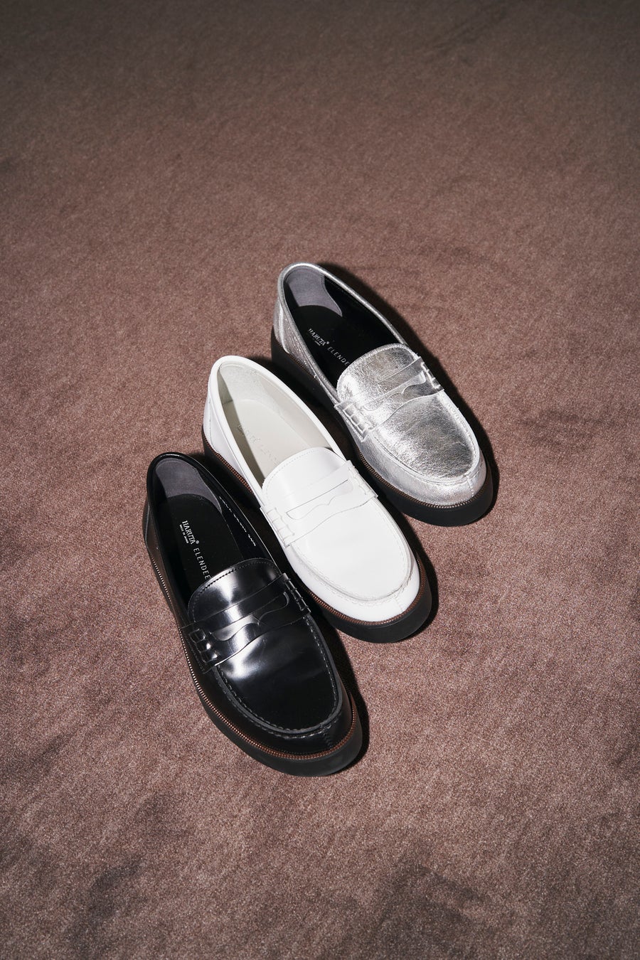 HARUTAのシグネチャーモデル「コインローファー」は、学生の時に1度は履いたことがあるであろうシューズ。本モデルを大人がモードに履けるよう厚みあるソールにアレンジしました。カラーは、定番カラーのブラックに加え、ELENDEEKらしいシルバー、モード感のあるホワイトの3色展開します。