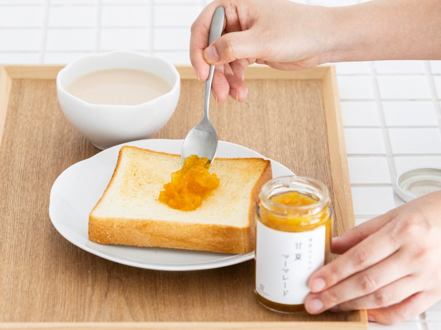 ちょっぴりほろ苦い甘夏のジャムは、ホットケーキやスコーンに添えたり、パウンドケーキに混ぜ込んだり……。でもやっぱり、厚切りのバタートーストに甘夏ジャムをたっぷりのせる食べ方が一番好きです。