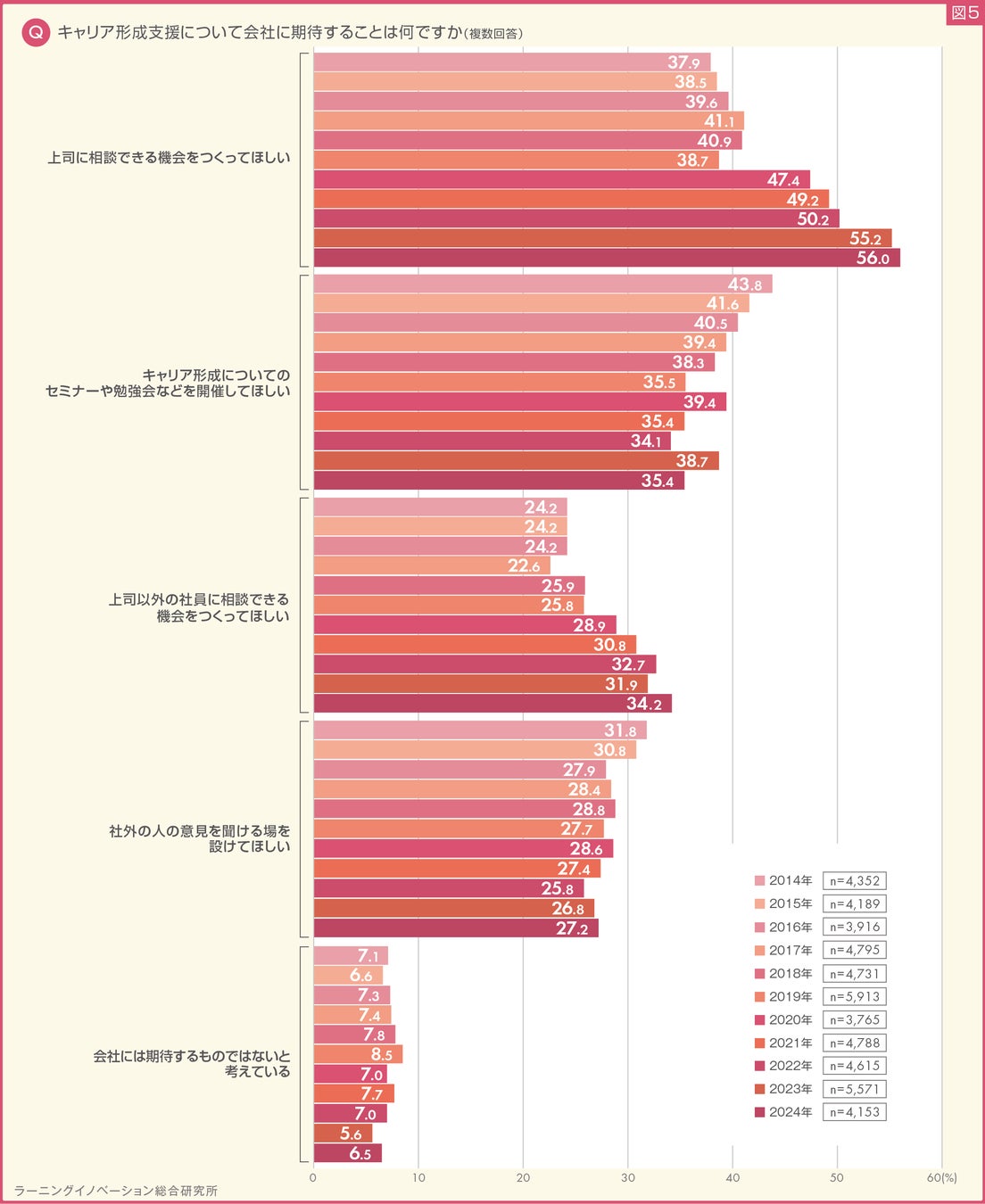 5. 【過去10年と比較】会社に求めるキャリア形成支援、「上司へ相談できる機会」過去最大(56.0%)