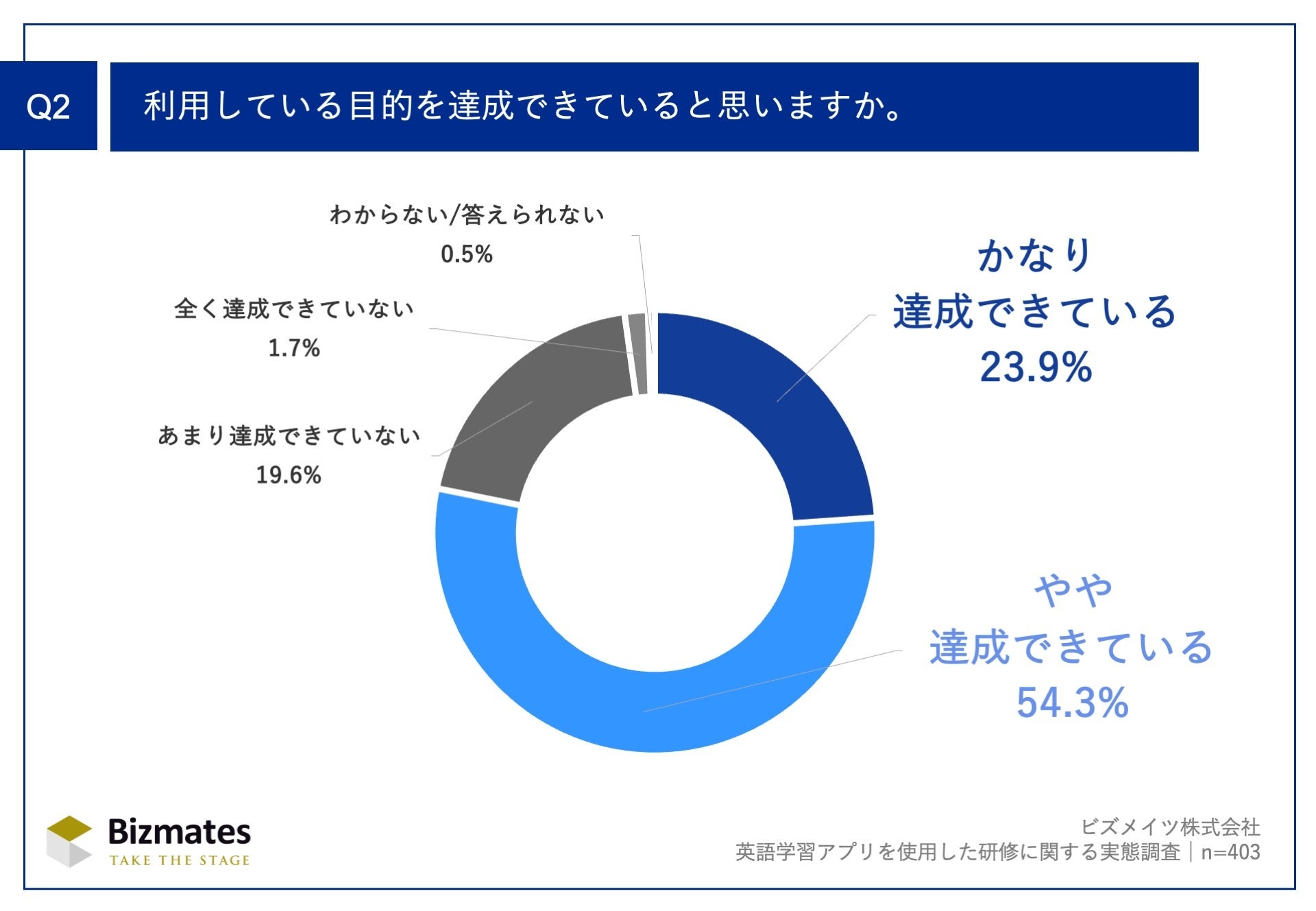 Q1で「わからない/答えられない」以外を回答した方に、「Q2.利用している目的を達成できていると思いますか。」(n=403)と質問したところ、「かなり達成できている」が23.9%、「やや達成できている」が54.3%という回答となりました。