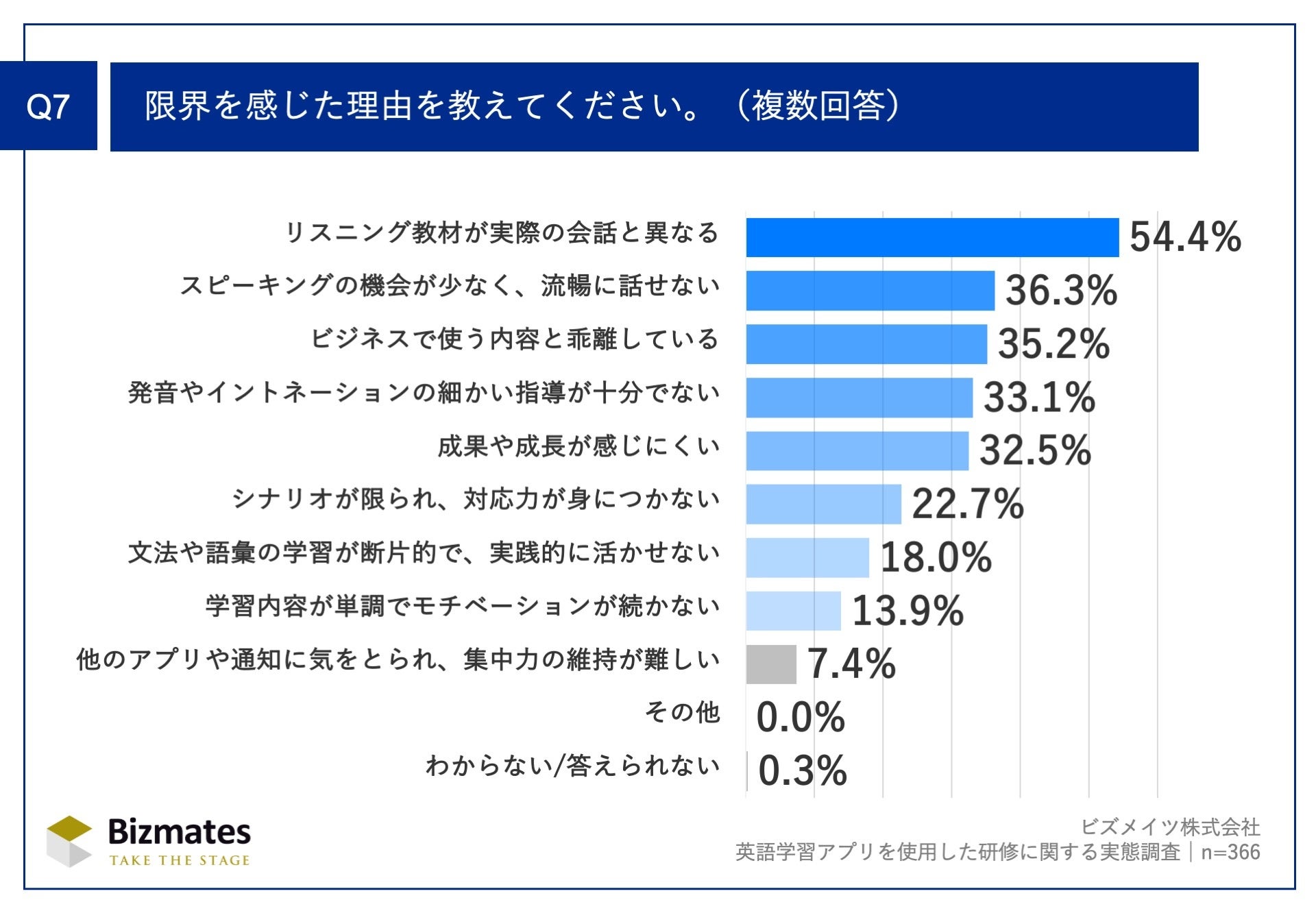Q6で「かなりある」「ややある」と回答した方に、「Q7.限界を感じた理由を教えてください。(複数回答)」(n=366)と質問したところ、「リスニング教材が実際の会話と異なる」が54.4%、「スピーキングの機会が少なく、流暢に話せない」が36.3%、「ビジネスで使う内容と乖離している」が35.2%という回答となりました。