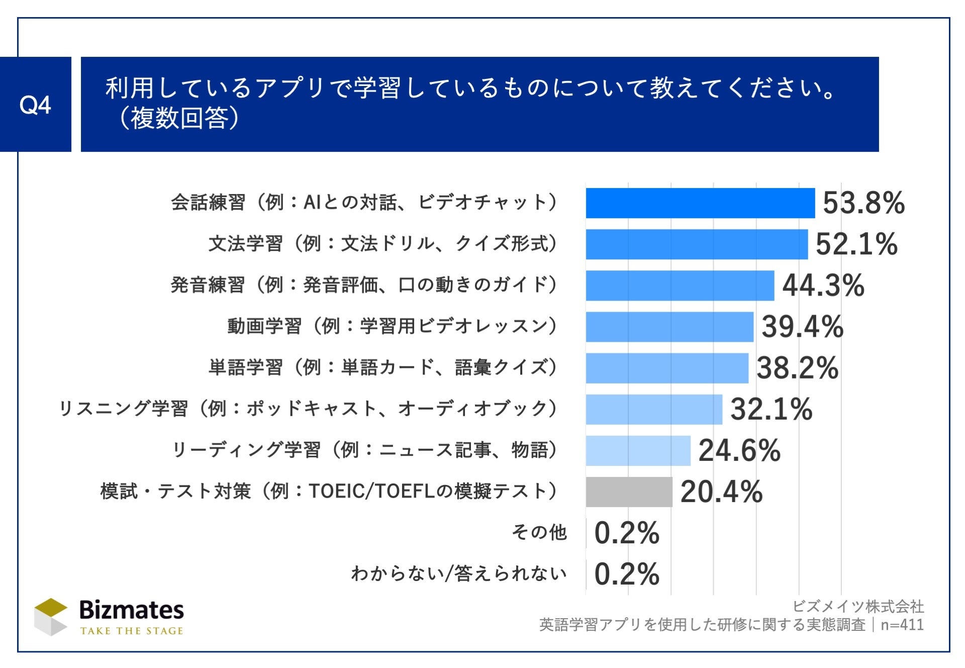 「Q4.利用しているアプリで学習しているものについて教えてください。(複数回答)」(n=411)と質問したところ、「会話練習(例:AIとの対話、ビデオチャット)」が53.8%、「文法学習(例:文法ドリル、クイズ形式)」が52.1%、「発音練習(例:発音評価、口の動きのガイド)」が44.3%という回答となりました。